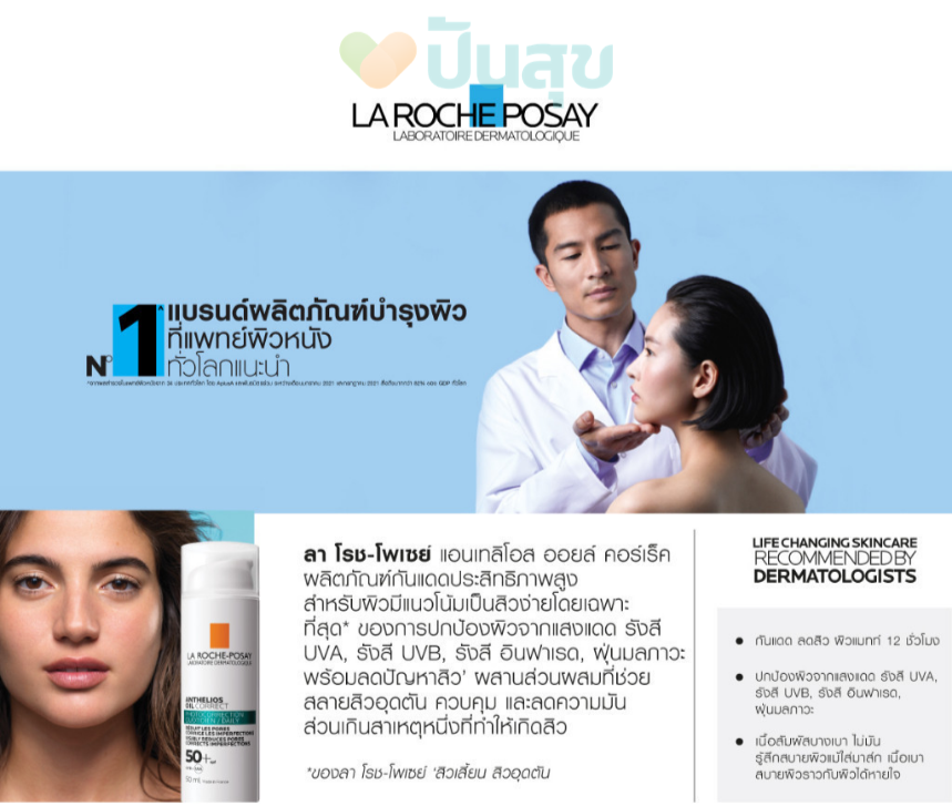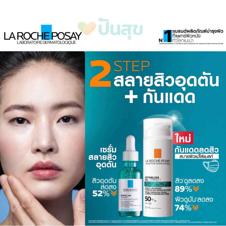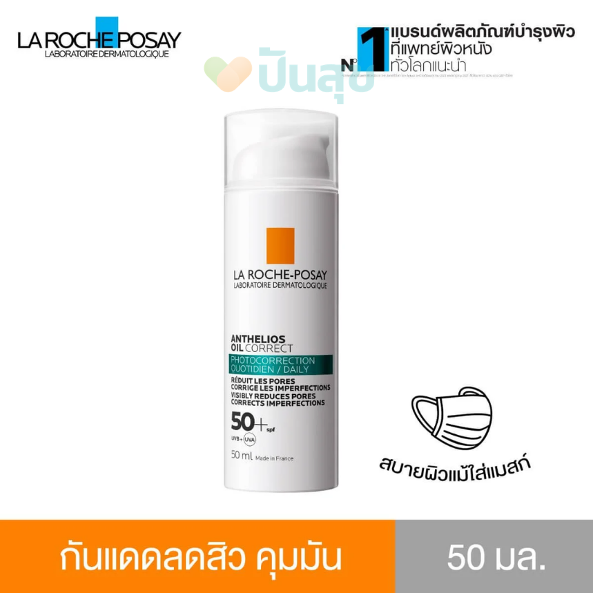 ลา โรช-โพเซย์ แอนเทลิโอส ออยล์ คอร์เร็ค เอสพีเอฟ 50+ (50 มล.) กันแดดลดปัญหาสิวและคุมมัน กันแดดสูตรสำหรับคนเป็นสิวง่าย ช่วยลดปัญหาสิวอุดตันและสิวเสี้ยน พร้อมปกป้องผิวจาก UVA, UVB, อินฟราเรด และฝุ่นมลภาวะ เนื้อสัมผัสบางเบา ไม่เหนียวเหนอะหนะ ให้ผิวดูแมทท์ยาวนาน 12 ชั่วโมง ควบคุมความมันส่วนเกินและรอยดำจากสิวด้วยโมเลกุลที่ได้รับแรงบันดาลใจจากทางการแพทย์