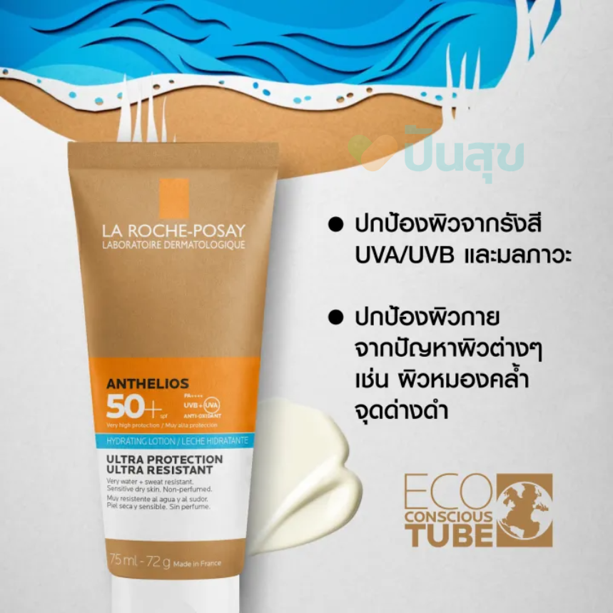 ลา โรช-โพเซย์ แอนเทลิโอส ไฮเดรตติ้ง โลชั่น เอสพีเอฟ 50+ (75 มล.) กันแดดเนื้อโลชั่น กันแดดเนื้อโลชั่นสูตรชุ่มชื้น ปกป้องผิวขั้นสูงครอบคลุมทั้ง UVA, UVB, อินฟราเรด-เอ และมลภาวะ โดดเด่นด้วยคุณสมบัติกันน้ำ ทนเหงื่อ ไม่ทิ้งคราบขาว และไม่เหนียวเหนอะหนะ ผ่านการทดสอบบนผิวบอบบางมีแนวโน้มระคายเคืองง่าย มอบความสบายผิวพร้อมการปกป้องยาวนาน